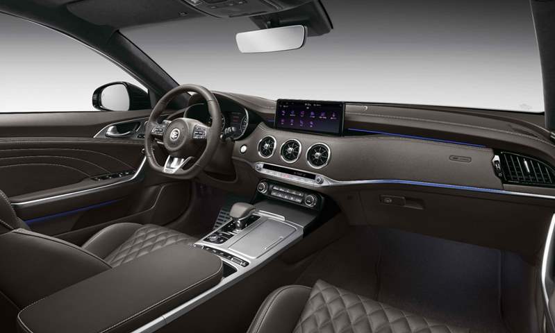 ظلت بنية المقصورة الداخلية في ستينجر المحدثة بلا تغيير، بما تحتويه من لوحة تحكم ممتازة مركزة على السائق ومساحة تتسع لما يصل إلى خمسة ركاب، فيما شهدت عدة تحسينات مبهرة في جوانب أخرى. وصُممت هذه التحديثات في الشكل والمواد المستخدمة، لتحسن قدرات ستينجر كسيارة سياحية، وتمنحها جوّاً أكثر فخامة.