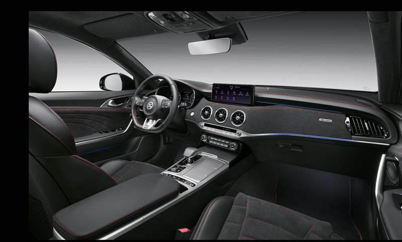 في الداخل حصلت ستينجر على شاشة نظام المعلومات والترفيه اختيارية جديدة مقاس 10.25 بوصة، مع القدرة على توصيل جهازين في وقت واحد عبر البلوتوث، أما الشاشة القياسية فهي بحجم 8 بوصات وتحل محل الشاشة القديمة مقاس 7 بوصات، وتعمل الشاشتان مع أبل كاربلاي وأندرويد أوتو، أما شاشة العدادات فهي تأتي بمقاس 4.2 بوصة بدلاً من الشاشة القديمة مقاس 3.5 بوصة.
