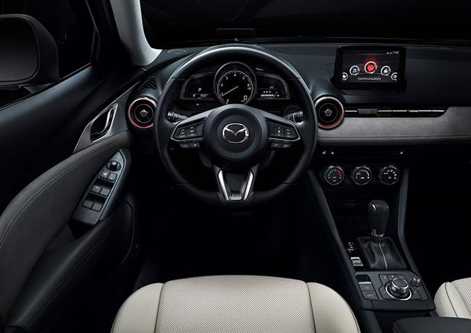 في الداخل تبدو المقصورة أنيقة بشكل واضح، فالمقاعد مكسوة بمزيج من الجلد والنسيج المبطن، وعجلة القيادة مدمجة وملفوفة بالجلد المحاك بخيوط بارزة، وهي تحتوي في اثنين من أذرعها الثلاثة على مجموعة من أزرار التحكم في وظائف الترفيه، وتستقر أعلى لوحة القيادة شاشة لمسية ملونة مقاس 8 بوصة.. أما على جانب القوة فتأتي CX-3 بمحرك SKYACTIV-D ديزل، لكن مازدا لم تكشف عن كامل تفاصيل الأداء بعد.