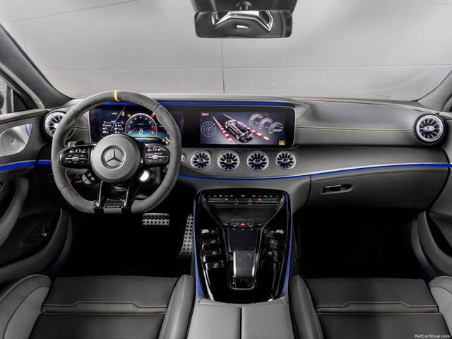 ماذا عن تفاصيل الداخل؟ مقاعد AMG مزودة بذاكرة لتذكر الأوضاع المفضلة ومكسوة بجلد نابا الفاخر تستقبل أجساد الركاب، وهي محاكة بخيوط صفراء بارزة هي نفسها الموجودة على لوحة القيادة، وتتناغم مع اللمسة الصفراء الموجودة أعلى عجلة القيادة وأحزمة الأمان التي تأتي باللون نفسه.. وتحتل لوحة القيادة شاشتان لمسيتان كبيرتان إحداهما للعدادات والأخرى لنظام المعلومات والترفيه، وأسفلها أربع فتحات دائرية للمكيف مستوحاة من محركات الطائرات التوربينية، بينما تمتد إضاءة زرقاء محيطية لتشمل أعلى وأسفل لوحة القيادة وجانبي الكونسول الوسطي، أما عجلة القيادة فهي مسطحة القاعدة وملفوفة بجلد نابا الفاخر الذي تضم أطرافه خيوط مزدوجة بارزة باللون الأصفر، وعلى الذراع السفلي لها نُقشت حروف AMG وأسفلها كلمة EDITION.