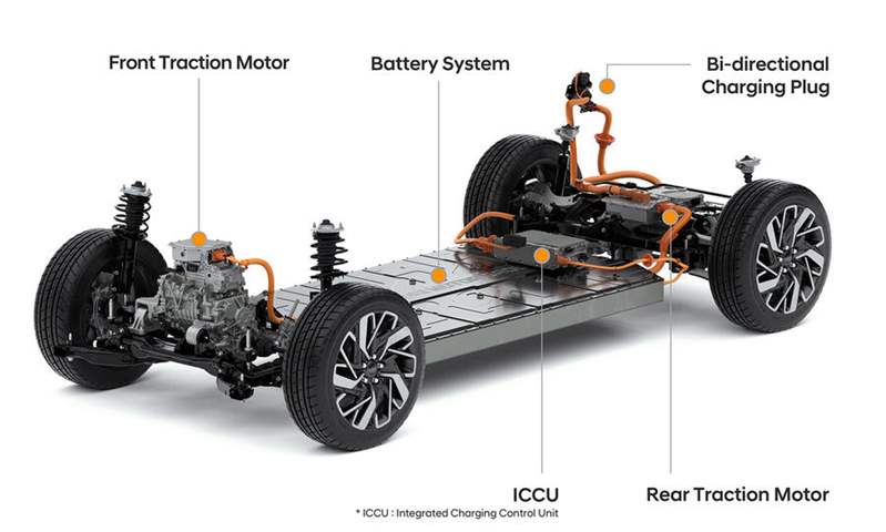 وقامت الصانعة الكورية بالتخلص من الشاحن التقليدي الموجود في سياراتها الكهربائية الحالية، لتعتمد على وحدة مدمجة للتحكم في الشحن (ICCU) تسمح بتدفق الكهرباء في كلا الاتجاهين، بحيث تمكن من استخدام المنصة E-GMP كمصدر طاقة لآلات كهربائية خارجية ومنها سيارات كهربائية. فهذه الخاصية الجديدة vehicle-to-load أو اختصارًا (V2L) تستطيع منح حتى 3.5 كيلووات من الطاقة.
