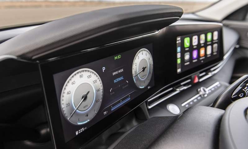 ربما تكون القفزة الأكبر في التجهيزات التقنية، إذ زودت هيونداي سيارتها إلنترا الجديدة بشاشة تعمل باللمس مقاس 8 بوصات ودعم لخدمتي أبل كار بلاي وأندرويد أوتو لتكون الأولى في فئتها.