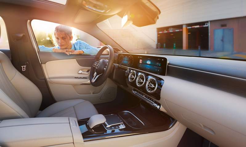 نظام الترفيه يتضمن شاشة عالية الوضوح بقياس 10.25 بوصة، تدعم خاصية الاتصال الحر بالهاتف الذكي عن طرق البلوتوث إلى جانب نظام MBUX المجهز بالذكاء الصناعي لتفعيل الجهاز الترفيهي في السيارة من خلال الأوامر الصوتية.