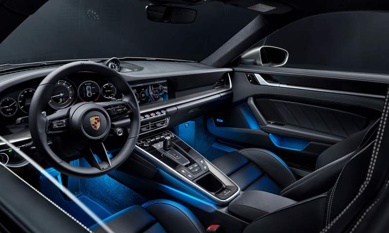في الداخل ينبغي أن نتحدث عن السقف، فهو مصنوع من مادة عازلة للحرارة وممتصة للصوت، ما يجعل المقصورة مكانًا مريحًا، ويمكنك بنظرة إلى المقصورة أن تلاحظ الخطوط الأفقية الموحية بالاتساع، كما ستلاحظ أن بورش قللت في سيارتها من عدد أدوات التحكم وأصبح كل شيء في متناول السائق مباشرةً. وتضيف التفاصيل الجلدية الكثير من الأناقة إلى المقصورة، مع تطعيمات زخرفية باللون الفضي الداكن.