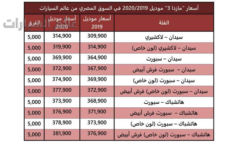 ويُطرح موديل 2020 من "Mazda3" بزيادة 5,000 ج. م. على كافة فئات السيارة التي تصل إلى 10 فئات بشكليها السيدان والهاتشباك. وتأتي أسعار موديل 2020 مقابل موديل 2019 على النحو التالي: