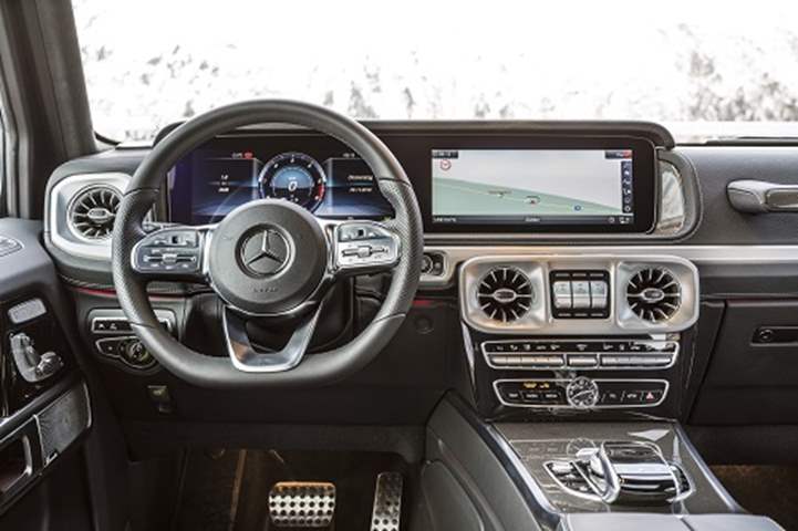 تدمج السيارة G-Class بين خصائص القيادة على الطرق الوعرة وأعلى مستويات الفخامة في فئتها. فقائد السيارة يجلس في وضع مرتفع بما يضمن له رؤية واضحة تمامًا واحساس مميز ومختلف أثناء القيادة. من العناصر المميزة للتصميم الداخلي، المقبض الأمامي بالتابلوه، ومفاتيح الكروم الخاصة بالقيادة على الطرق الوعرة، مع استخدام مواد وخامات فائقة الجودة. تتضمن السيارة شاشتين قياس 12.3 بوصة، ونظام Burmester® الصوتي المحيطي ومقاعد كهربائية توفر أعلى درجات الراحة وأحزمة أمان حمراء والخياطة العلوية متناسقة الألوان والتي تضيف المزيد من التميز للتصميم الداخلي الحصري لهذه السيارة.