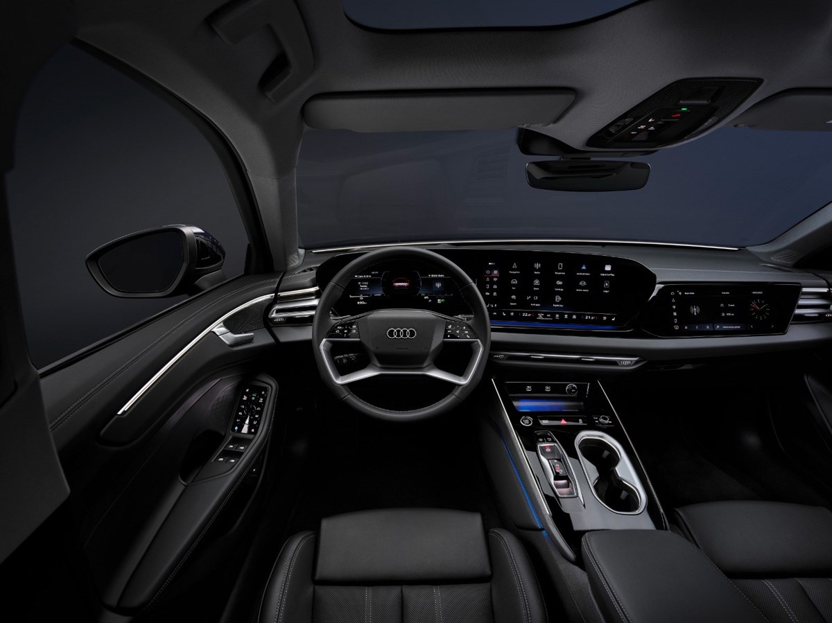 وبالانتقال إلى المقصورة الداخلية، نجدها تختلف اختلافًا جذريًّا عن مقصورة الجيل السابق، من خلال تصميمها العصري الذي يغلب عليه طابع البساطة من دون تكلُّف (Minimalist) مدعومًا بأحدث التقنيات. إن أبرز ما يجذب الانتباه بالمقصورة الداخلية هو الشاشة البانورامية المنحنية التي تضم شاشة عالية الوضوح قياس ١١.٩ بوصات للوحة العدَّادات (Audi Virtual Cockpit Plus) وأخرى قياس ١٤.٥ بوصات عاملة باللمس للنظام المعلوماتي الترفيهي. وهناك كذلك الشاشة الإضافية أمام الراكب الأمامي قياس ١٠.٩ بوصات مع الفئة S-Line Plus الأكثر فخامة.
