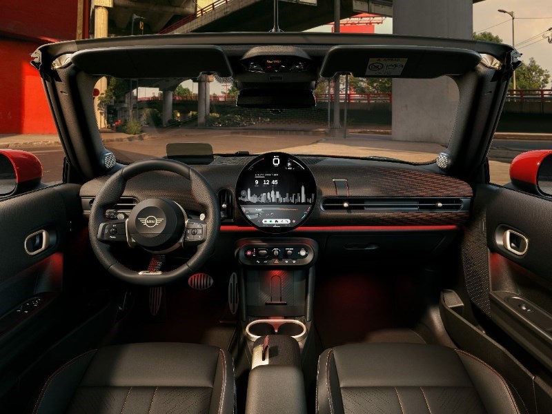داخل المقصورة، يطغى الطابع البسيط المستوحى من سيارات MINI الكلاسيكية، مع شاشة OLED دائرية جديدة بقياس 9.4 بوصة، وأوضاع قيادة متعددة MINI Experience Modes، وعداد "Always Open Timer"، وشاشة عرض أمامية Head-Up Display. تشمل التجهيزات أيضًا مقاعد رياضية بكسوة من القماش وجلد Vescin، مقعد سائق كهربائي مع خاصية التدليك، مكيف هواء أوتوماتيكي ثنائي المناطق، مقود JCW مدفأ، وشاحن لاسلكي للهاتف، إلى جانب نظام صوتي فاخر من Harman Kardon بقدرة 365 واط و12 سماعة.