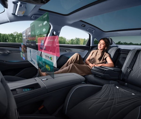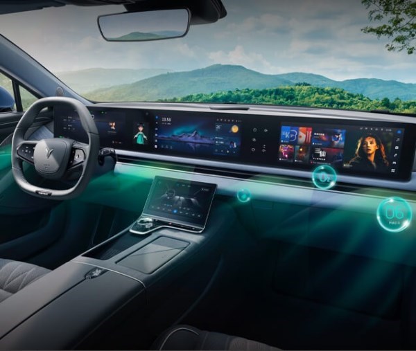 تمثل مقصورة فويا Passion قمة ما يمكن أن تقدمه السيارات الكهربائية من رفاهية وأناقة. في مقدمة هذه المزايا تأتي ثلاث شاشات عالية الدقة بقياس 12.3 بوصة لكل منها، إلى جانب شاشة عرض رأسية بتقنية الواقع المعزز (AR HUD)، وشاشة إضافية مدمجة في مسند الذراع الخلفي لراحة الركاب.