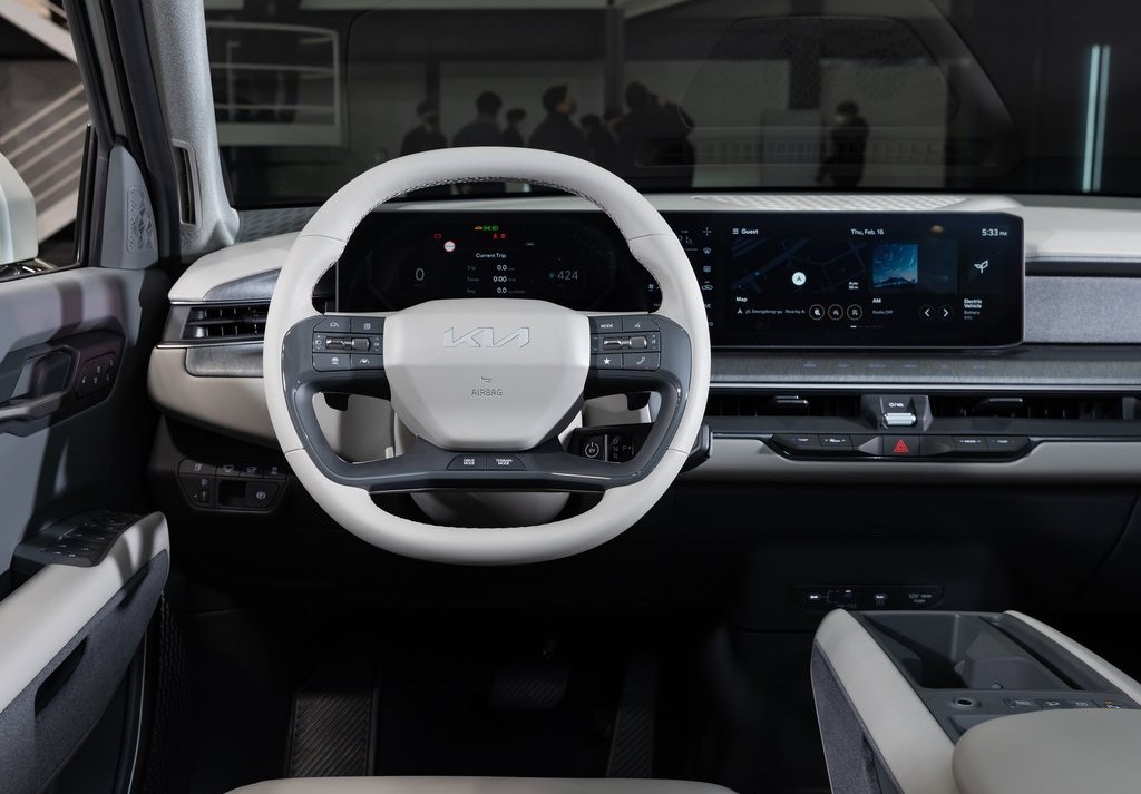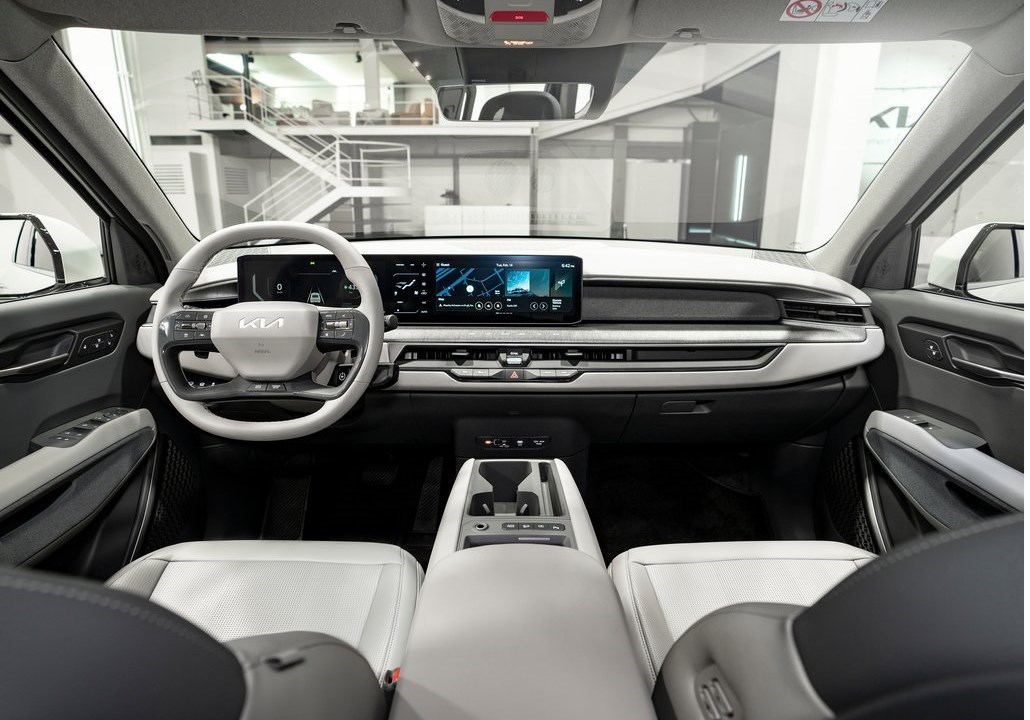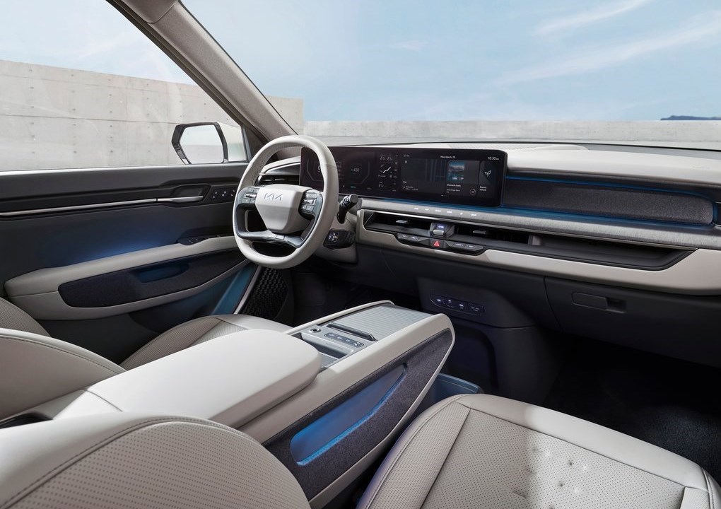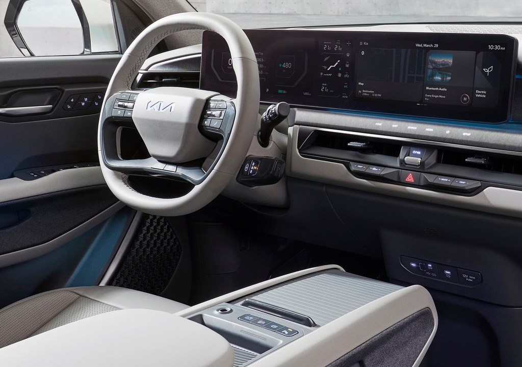 في جميع أنحاء المقصورة الواسعة والخفيفة والمتجددة الهواء، تجسد EV9 تصميماً بسيطاً أنيقاً وعالي الجودة وسهل الاستخدام بشكل استثنائي. وتمتد لوحة التحكم البانورامية المفتوحة والعائمة، من عجلة القيادة إلى مركز السيارة. وتعمل الشاشتان باللمس مقاس 12.3 بوصة، بشكل متكامل مع شاشة عرض واحدة مقاس 5 بوصات على تحسين التجربة الرقمية، ما يوفر تحكماً سهلاً في وظائف السيارة ويضمن الحفاظ على الأزرار المادية إلى الحد الأدنى.