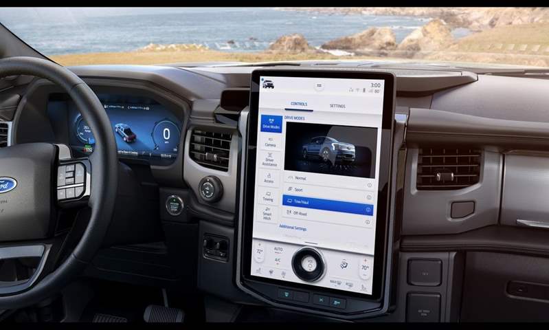 واستمرت التشابهات مع F-150 البنزينية داخل المقصورة، حيث تحتوي لوحة القيادة على شاشة رقمية مقاس 12.0 بوصة للعدادات، وأخرى تعمل باللمس مقاس 12.0 بوصة أيضًا وذلك في الإصدار القياسي، ولكن في الإصدارات الأعلى تأتي شاشة اللمس أكبر حجمًا مقاسها 15.5 بوصة تستقر بشكل رأسي وتعمل بنظام Sync 4A من فورد، كما تحتوي على مفتاح بارز في الأسفل كما في موستانج Mach-E.. ويمكن الاختيار بين أربعة أنظمة للقيادة هي: Normal، Sport، Off-Road، و Towing.