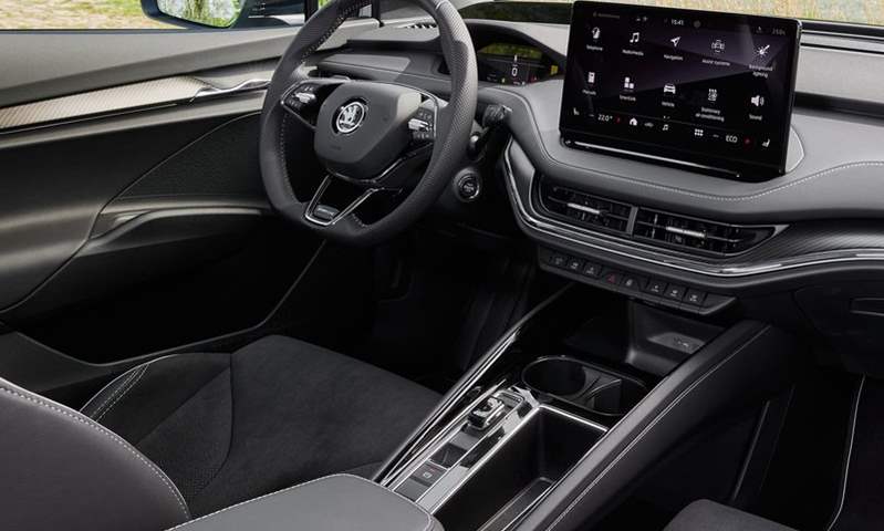 وقد تم تصميم عجلة القيادة الرياضية متعددة الوظائف بأحدث تصميمات سكودا. حافة عجلة القيادة منجدة بالجلد ويمكن تسخينها، وتتميز بخياطة متناقضة باللون الرمادي. يحتوي الضلع السفلي لعجلة القيادة على شارة تحمل حروف SPORTLINE. يمكن التحكم في العديد من وظائف السيارة مباشرةً من عجلة القيادة باستخدام أزرار سهلة التشغيل. يؤدي الضغط على زر في الكونسول الوسطي إلى نقل السائق مباشرةً إلى قائمة اختيار وضع القيادة (ميزة قياسية)، المعروضة على شاشة المعلومات والترفيه المركزية مقاس 13 بوصة. من هناك ، يمكن للسائق الاختيار من بين أوضاع Eco وComfort وNormal وSport وIndividual.