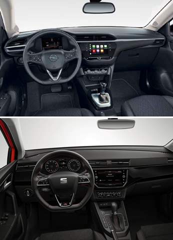تتمتع أوبل كورسا بإطلالة عصرية ذات طابع أنيق، بينما تتسم سيات إبيزا بطابع أكثر رياضية خاصة في الفئة الثانية منها، حيث تم تعزيزها بمجموعة FR الرياضية التي تتضمن (شبكة أمامية رياضية مع شعار FR، مصدات أمامية وخلفية FR، أغطية مرايا الأبواب FR في لون أسود لامع، ونظام تعليق رياضي FR).