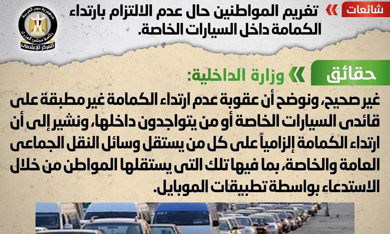 انتشرت الشائعات خلال الأيام الماضية على بعض المواقع الإخبارية ومواقع التواصل الإجتماعي حول فرض وزارة الداخلية وإدارة المرور غرامات مالية على سائقي السيارات الملاكي الخاصة لعدم التزام السائقين بارتداء الكمامة الواقية خلال السير.